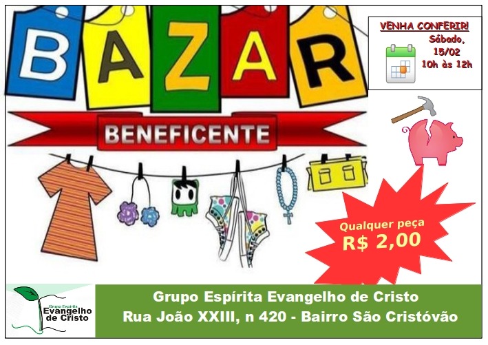 Bazar a R$ 2,00 GEEC 13 de fevereiro de 2020 Eventos Singular: 0 comentárioSó nesse sábado dia 15/02/2020 qualquer peça do Bazar Beneficente por apenas R$ 2,00!!Tagged Bazar Evento BeneficenteNavegação de PostPróximo Próximo post: Seminário Atendimento Espiritual na Casa EspíritaDeixe um comentário Cancelar respostaO seu endereço de e-mail não será publicado. Campos obrigatórios são marcados com *Comentário *Nome * E-mail * Site Salvar meus dados neste navegador para a próxima vez que eu comentar. Δ